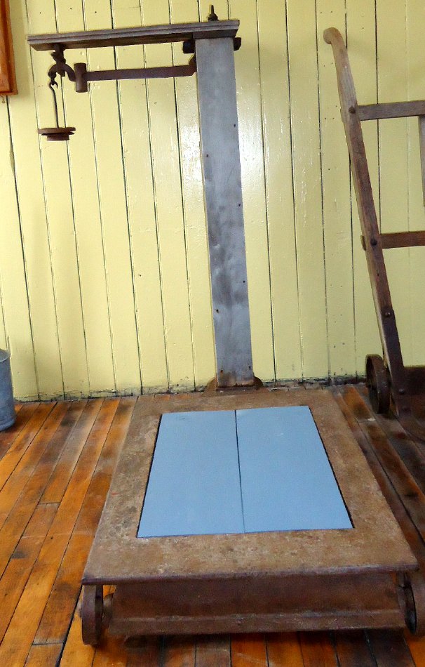 To weigh an object on this scale weights were added to the rod that hangs down on the left side. Once the correct weights were added to the scale the moveable weight on the balance arm was slid over until the arm balanced or floated evenly up and down. This scale could weigh up to 800 pounds.