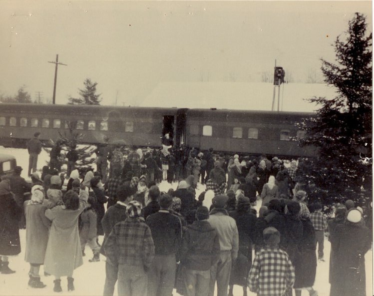 Arrival of Santa Claus in Amberg on the afternoon "Chippewa" train. All elementary Amberg School classes were excused so children could greet Santa while Christmas music was played from Downing's Grocery Store across the street. Sometimes the "Glee Club" sang at the event.