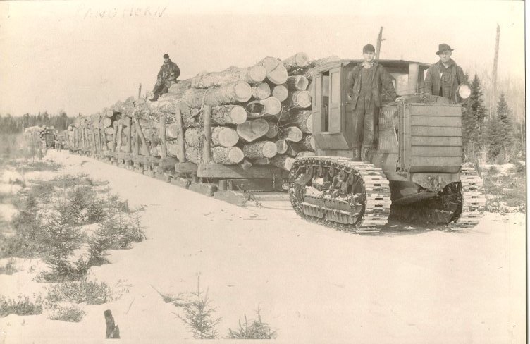 A holt crawler pulling a long train of logging sleighs on a iced road at Panghorn. The logs were cut from one of the last stands of virgin timber owned by the Sawyer Goodman Company.