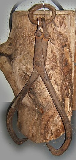 The open end of the skidding tongs were placed over the end of a log and a chain was attached to the loop on the other end so horses could skid or move the logs to where they could be loaded.