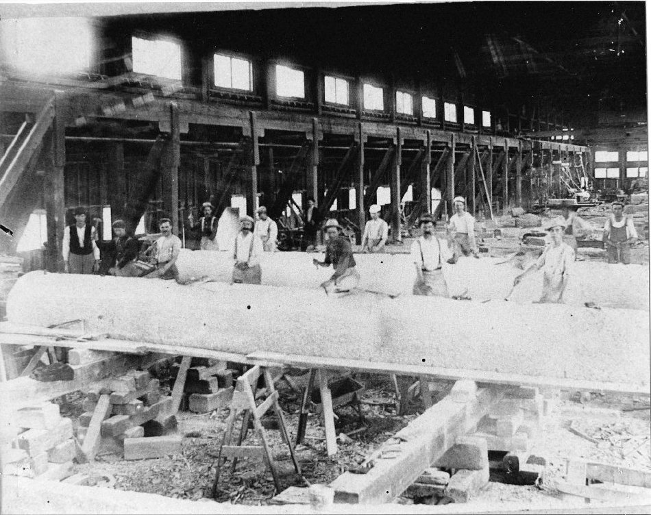 The picture shows workers from the Amberg Granite Company in the large stone shed working on finishing large round columns. The company had contracts for the Chicago Post Office, the Capitol building in St. Paul, the Mausoleum in Chicago, and other building projects. Sixty-five stone cutters and fifteen drillers worked in the shed which was 410 feet long and 100 feet wide.