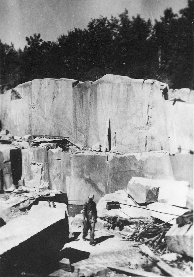 August Paveglio Quarry or Peninsula Quarry was purchased by August Paveglio from the original owner, Victor Johnson. The quarry was operated by Paveglio for about thirty-five years. The granite was sold at the Peninsula Marble and Stone Company in Iron Mountain, MI. The person in the picture is Alex Leonhardt.