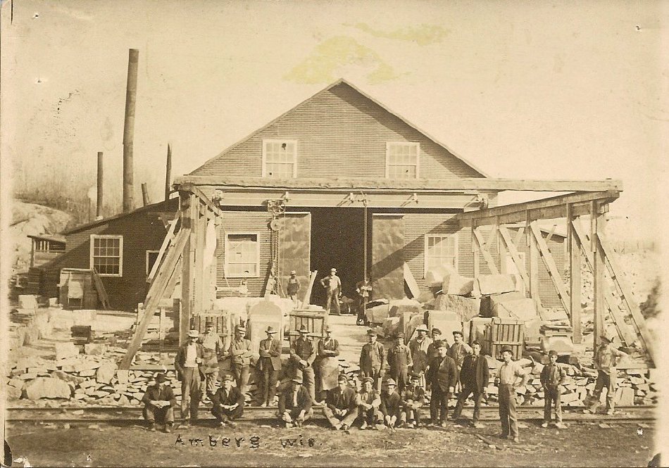 Pike River Granite Company plant located on the south end of Amberg east of the railroad tracks. The Amberg plant had about fifteen workers and received wages averaging from four to five dollars a day for nine hours work. The plant produced an average of twenty two carloads of monumental stone each year. The company operated quarries in Amberg and Middle Inlet and a shed in Marinette. The building later became a sawmill.