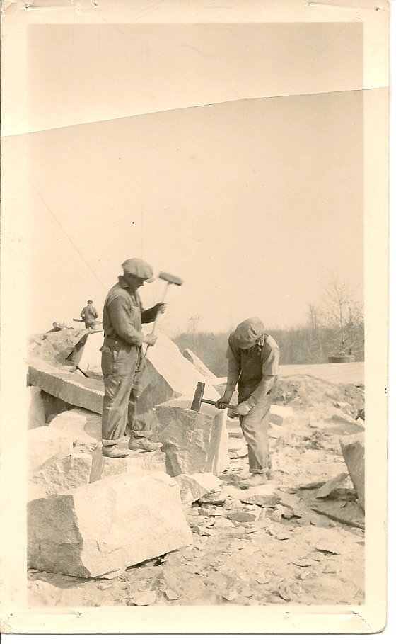 One worker in this photograph is swinging the maul and the other holding the bull set to shape the granite knocking off small pieces with each swing of the mall. Do you think they took turns?