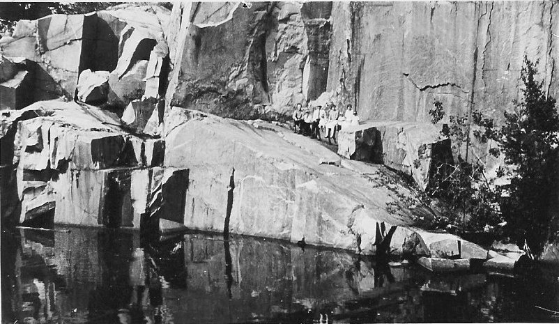 Picture of the Martindale Quarry originally owned by William Amberg which furnished a fine grained grey granite. In the picture from left to right: Seth Rautio, Harry Wilson, Chester Wilson, Edwin Wilson, Era Johnson, and Irene Wilson (Schaffer).