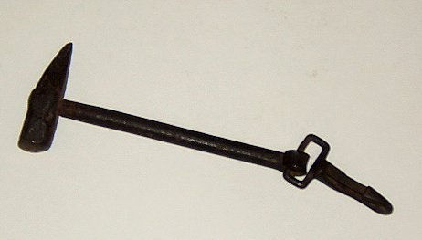 You did not go to the store to get a snow knocker. It was made by a blacksmith. The tool hung on a horse's harness and was used to remove or "knock" out snow when it collected in the horse's hooves. Why do you think it was made to hang from a harness?