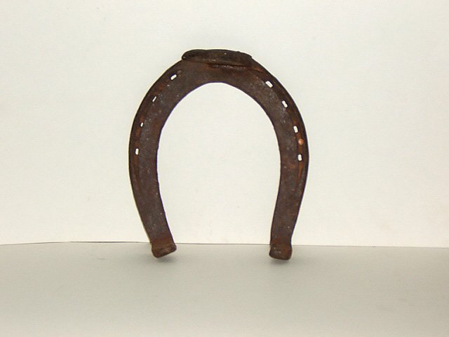 A hot horseshoe which was heated in a forge and bent to fit the correct size of a horse's hoof. After fitting the shoe is cooled in water and nailed to the white line of the hoof.