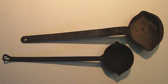 Ladles are used to pour liquids. You may have used one to pour soup into a bowl. The ladles shown here were used to put hot molten lead into a mold that was used to seal cast iron sewer pipes.