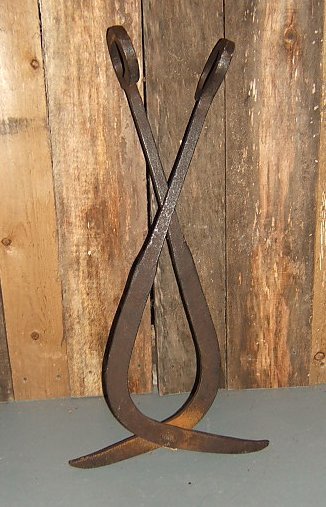 Hand forged tool with two handles, rivet, and pointed ends. Use unknown.