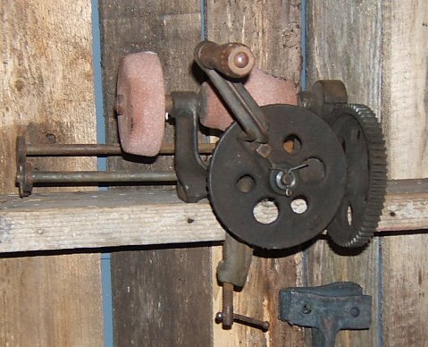 This was a multipurpose hand cranked grinder. You can see the gears used to increase the speed of the grinder. The grinding wheel to the right sharpened both sides of a sickle mower blade. The other wheel was used to grind and sharpen other tools.