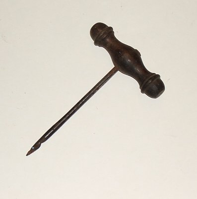 This gimlet has a wood handle that made it particularly handy for drilling a small hole to start a screw in hardwood. Gimlets also were made to fit into a hand drill brace.