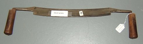 Drawknife work using a large drawing knife like this one was often done on a "shaving horse" which held the piece of wood in place.