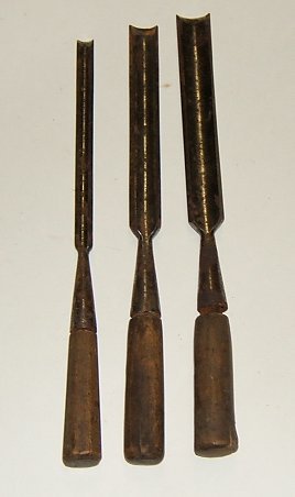 Set of three woodworking gouges with wood handles.