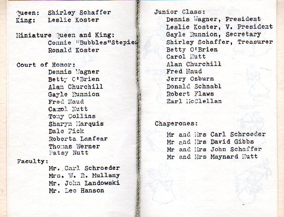 Amberg High School prom keepsake highlighting favorite sports, football scorecard, autographs, dates to remember; prom queen, Shirley Shaffer and prom king, Leslie Koster; faculty, honor court, junior class, and chaperones.