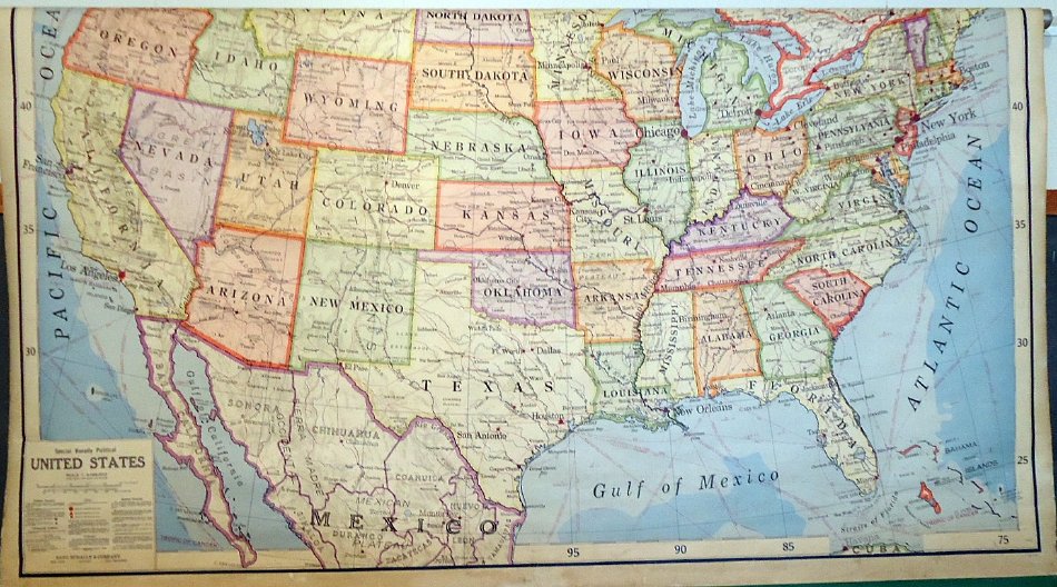 Rand McNallay political roll-down school map of the 48 United States from Amberg School.