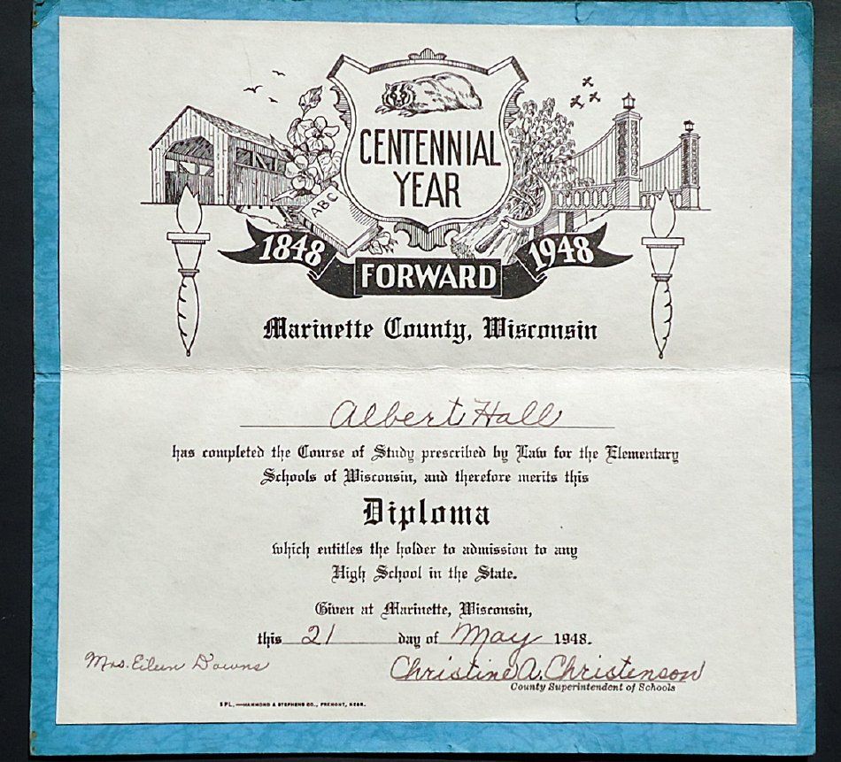 8th grade graduation diploma given to Albert Hall with recognition of the centennial year of the state of Wisconsin, 1848-1948 and state motto, Forward printed at the top.