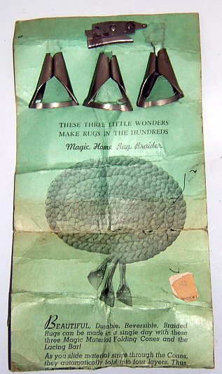 Braided rugs were often made from scraps of material from disarded clothing. It was similar to braiding ones hair. Look closely at the image to see how the three metal cones were used.