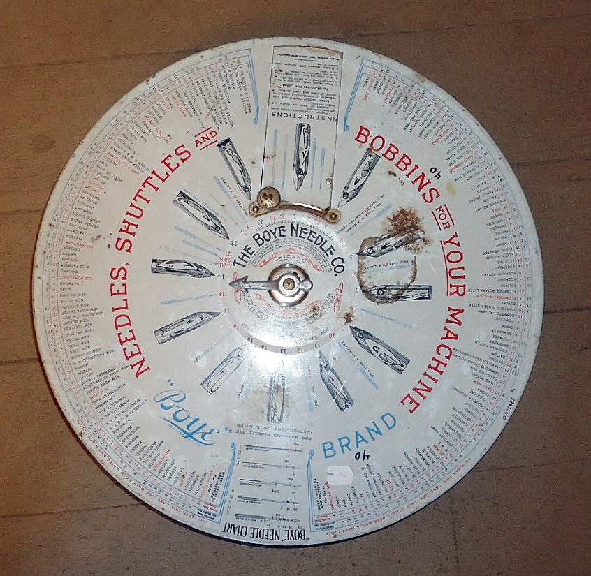 Boye needle and bobbin holder with an assortment of needles and bobbins from the Dekeuster Grocery Store.